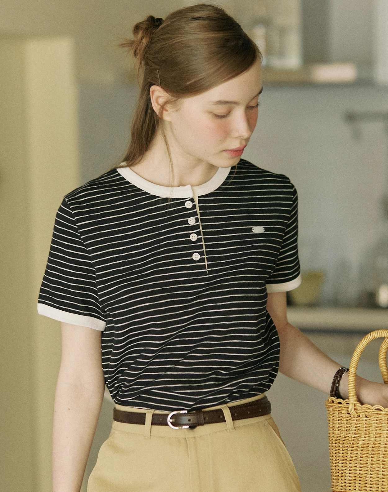 Cotton Stripe Henley Neck T-shirt - Black