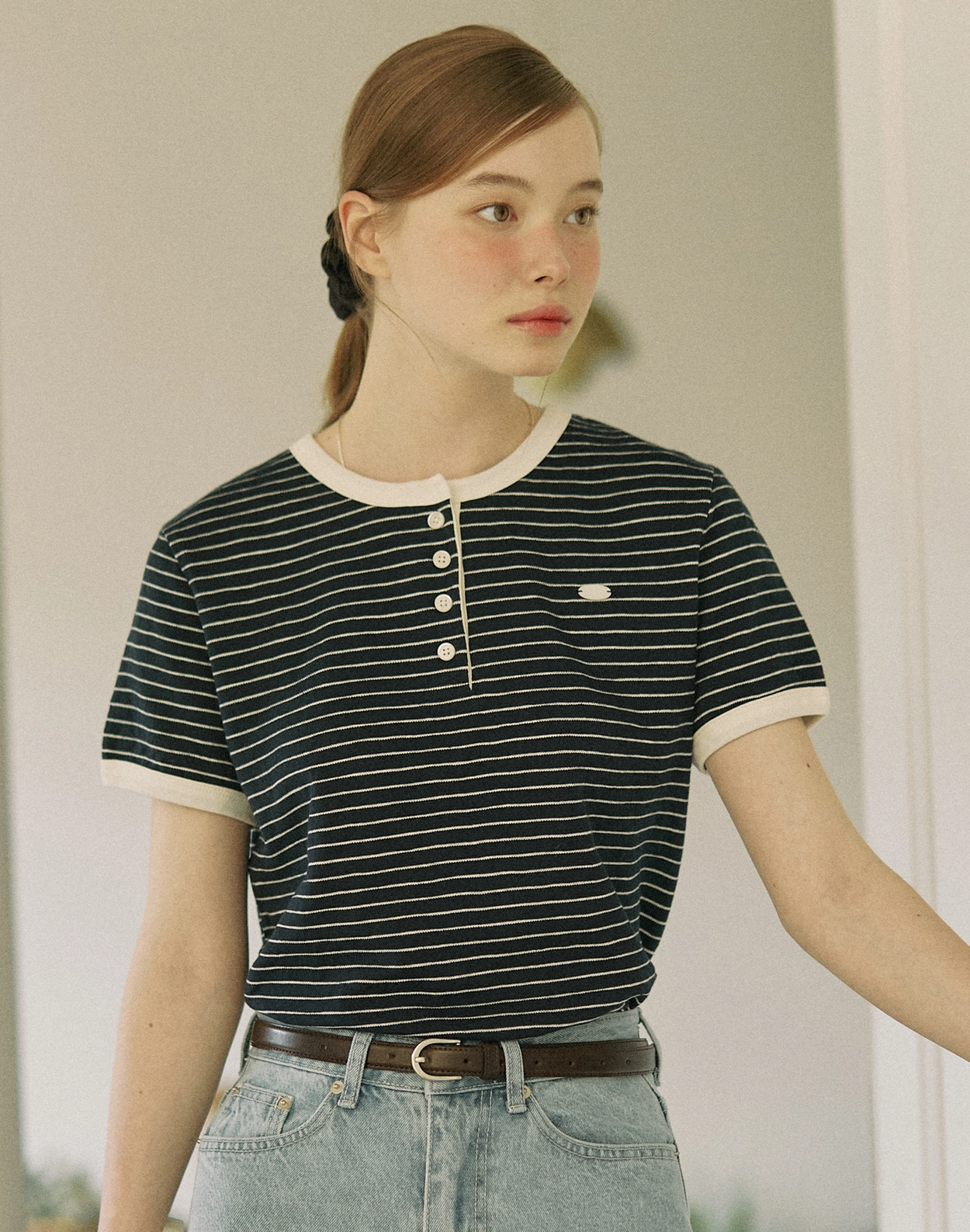 Cotton Stripe Henley Neck T-shirt - Navy