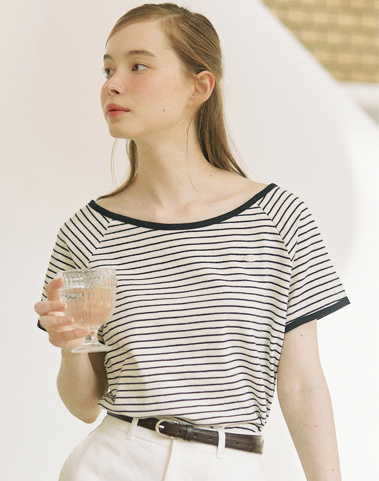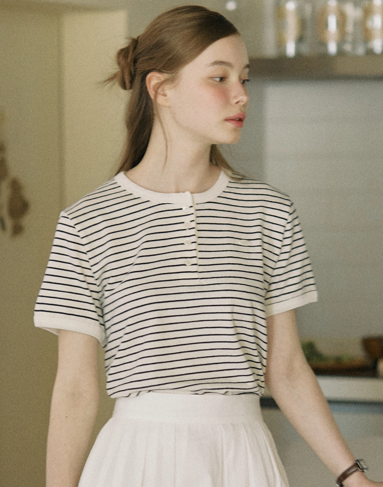 Cotton Stripe Henley Neck T-shirt - White
