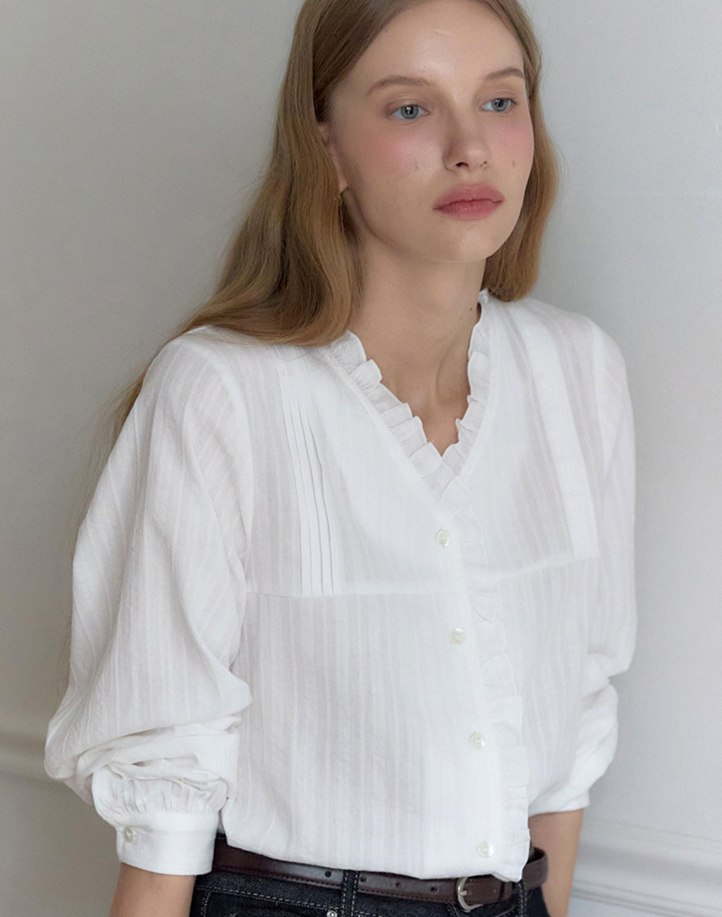 V-Neck Ruffle Pintuck Blouse - Ivory