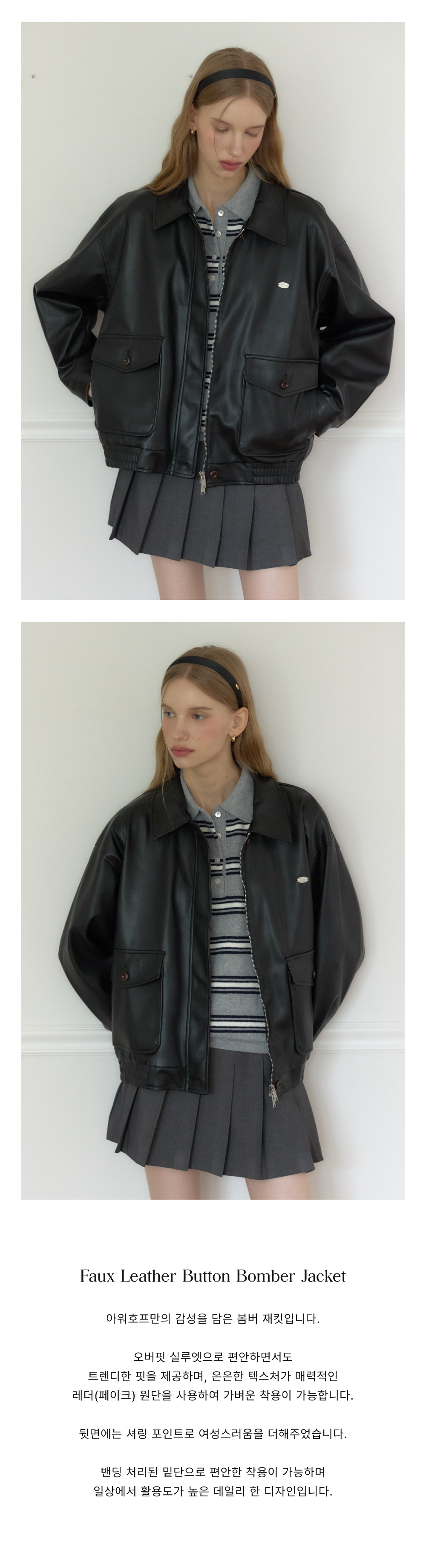 Faux Leather Button Bomber Jacket - Black