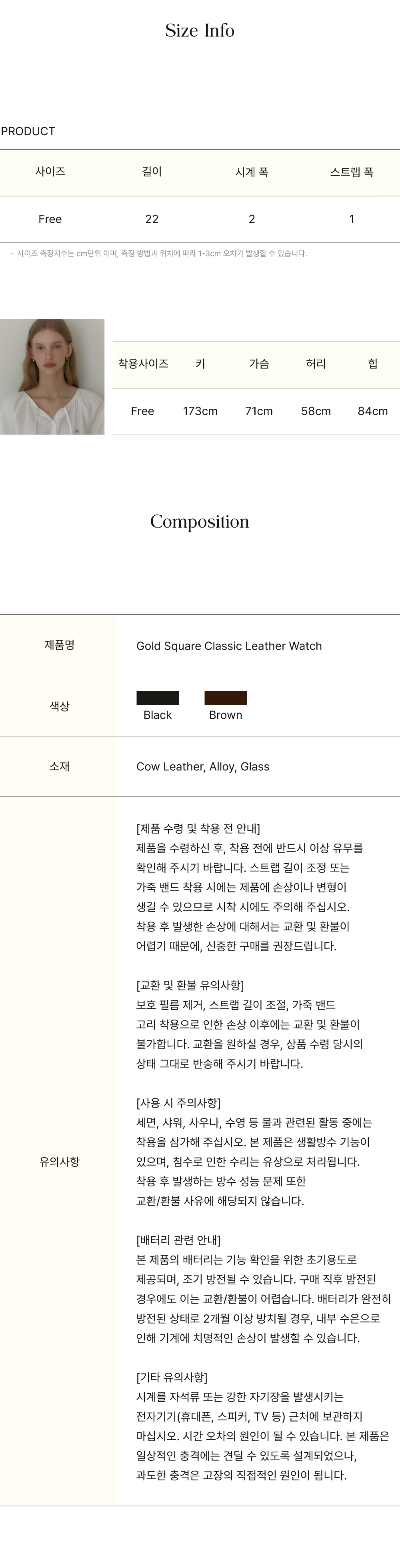 - 보호 필름 제거, 스트랩 길이 조절, 가죽 밴드 고리 착용으로 인한 손상 이후에는 교환 및 환불이 불가합니다.
