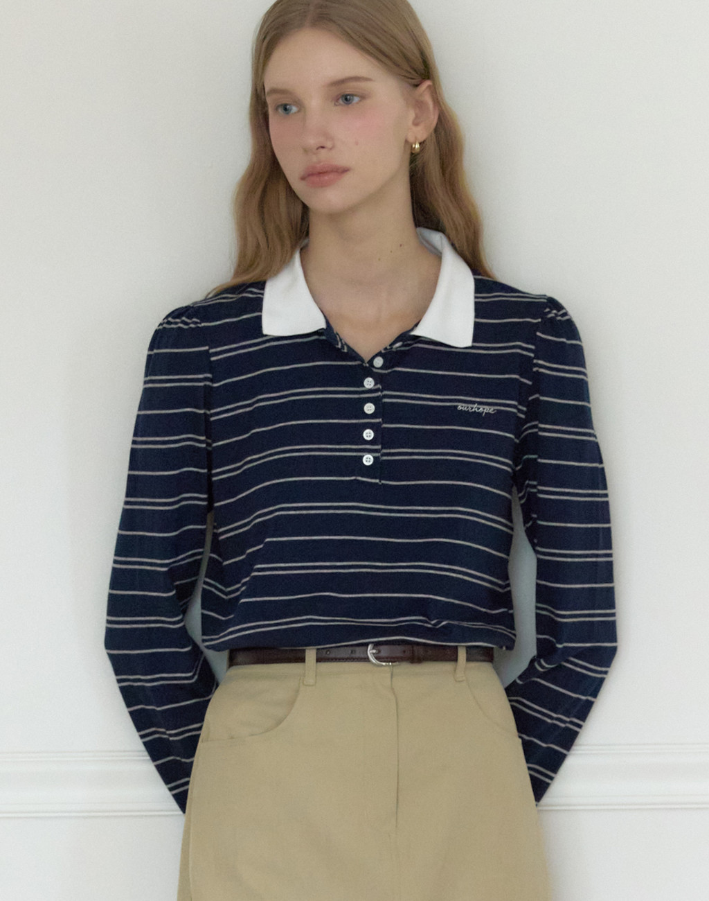 Stripe Shirring Pique Sleeve T-shirt - Navy