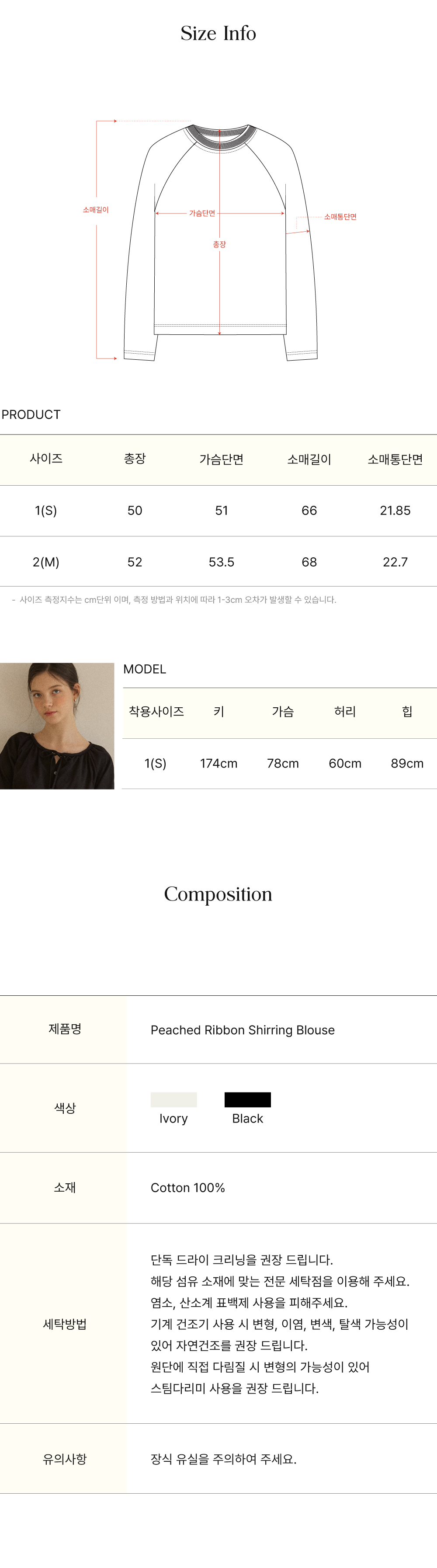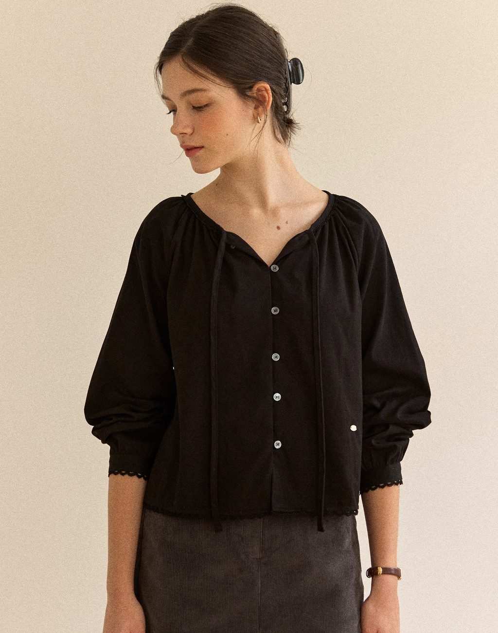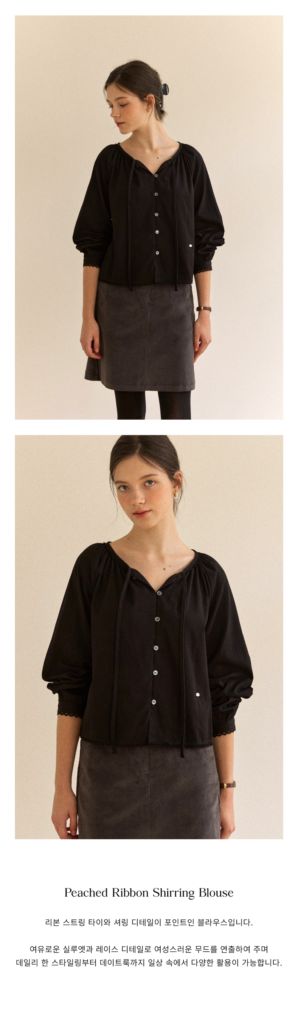 Peached Ribbon Shirring Blouse - Black