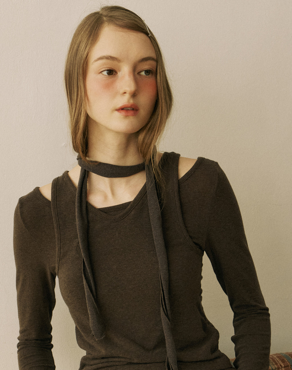 Wool Scarf Layered Long Sleeve - Brown